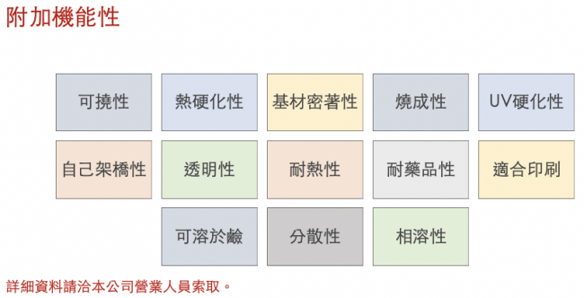 | 耐藥品性 | 適合印刷 | 可溶於鹼 | 分散性 |