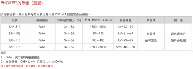 | ZAH-310 | PMA | 34~36 | 1300~2000 | AV=93~99 | 分散性 鹼可溶性 |